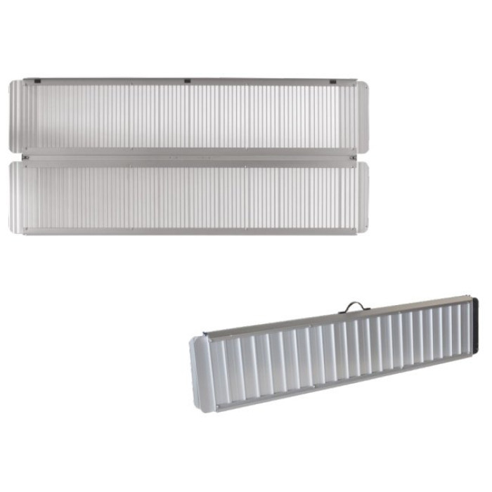 Rampa metálica plegable para descarga de mercancía pesada. Pensada para descarga desde furgonetas. Se pliega longitudinalmente en 2 partes, con un asa para poder transportarla y colocarla en un lateral de la furgoneta. Longitud de la rampa: 182 cm Ancho total desplegada: 72cm Ancho total plegada: 36cm Altura de las paredes laterales: 3,5cm. Proporcionan una seguridad para no salirse del carril. Peso máximo transportable: 272Kg. Peso de la rampa: 16Kg Pendiente máxima: 20% Altura máxima de descarga desde furgoneta: 60cm