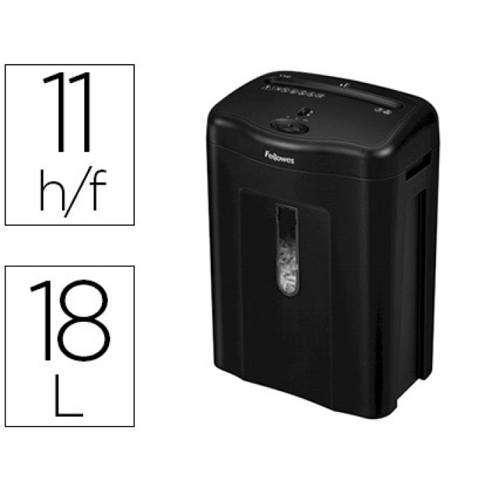 • Destructora de uso ocasional. Hogar y oficina en casa. 1 usuario • Destruye hasta 11 hojas en partículas de 4x52 mm . Nivel de seguridad P-3 • Ciclo de trabajo de 5 minutos • Capacidad de la papelera de 18 litros • Ancho de entrada de 230mm • Destruye grapas, tarjetas de crédito y clips • 2 años de garantía en la máquina y 3 años de garantía en cuchillas de corte Destructora de corte en partículas con sistema de bloqueo de seguridad