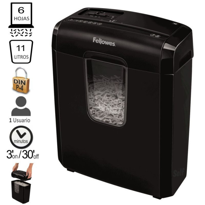• Destruye hasta 6 hojas de papel en partículas de 4 x 35 mm, nivel de seguridad (DIN P-4) • Bloqueo de seguridad para evitar accidentes • Ciclo de trabajo de 3 minutos • Cabezal extraíble para vaciar la papelera de 11 litros de capacidad • Destruye clips, grapas y tarjetas de crédito • 2 años de garantía en la máquina y 3 en las cuchillas de corte Ideal para un uso ocasional en hogar y oficina en casa