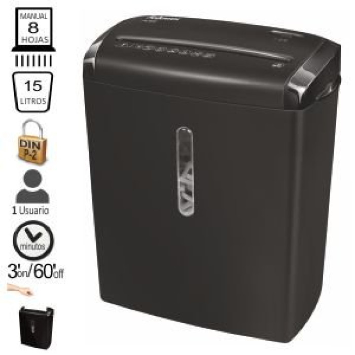 • Destruye hasta 8 hojas de papel en partículas de 4 x 35 mm, nivel de seguridad (DIN P-4) • Bloqueo de seguridad para evitar accidentes • Ciclo de trabajo de 3 minutos • Cabezal extraíble para vaciar la papelera de 14 litros de capacidad • Destruye clips, grapas y tarjetas de crédito • 2 años de garantía en la máquina y 3 en las cuchillas de corte Destructora de usos ocasional con sistema de bloqueo de seguridad