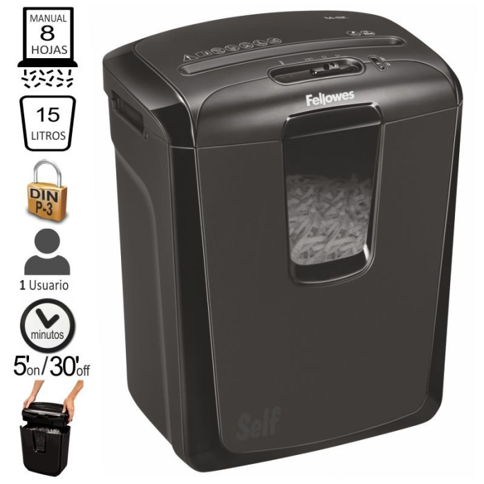 • Elegante y moderno diseño • Uso Moderado. Oficina en casa y despacho. 1 usuario • Destruye hasta 8 hojas en partículas de 4x46 mm. Nivel de seguridad moderado P-3 • Papelera de 15 litros, con capacidad diaria de destrucción para 60 hojas • Ciclo de trabajo 5 minutos • Destruye clips, grapas y tarjetas de crédito • Sistema de seguridad patentado para evitar accidentes • Calibrador de capacidad de hojas que evita que se introduzca más papel del que admite • 2 años de garantía en la máquina y 3 años de garantía en cuchillas de corte Destructora de corte en partículas con patentado Bloqueo de seguridad