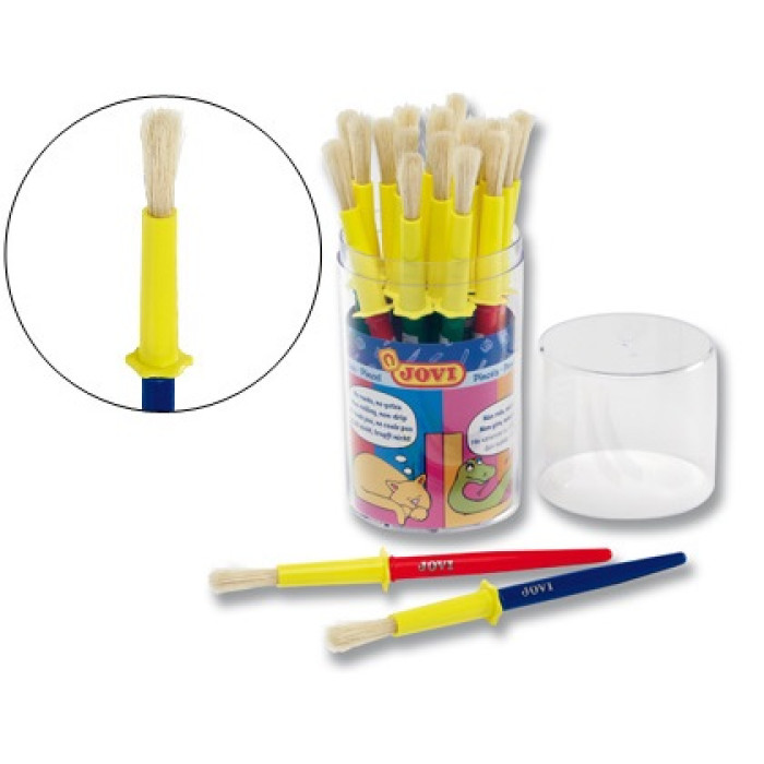 Pinceles escolares jovi -mediano bote de 20 unidades. Con adaptador irregular para evitar que rueden. Colores surtidos. No gotea. Presentado en bote de plástico.
