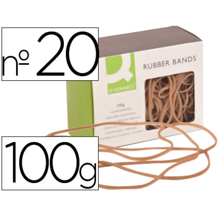 Gomillas elasticas q-connect 100 gr numero 20 200 x 2 mm. 80 % caucho de alta calidad y resistencia. Ancho de 2 mm. Su presentación en caja facilita su conservación y almacenamiento.