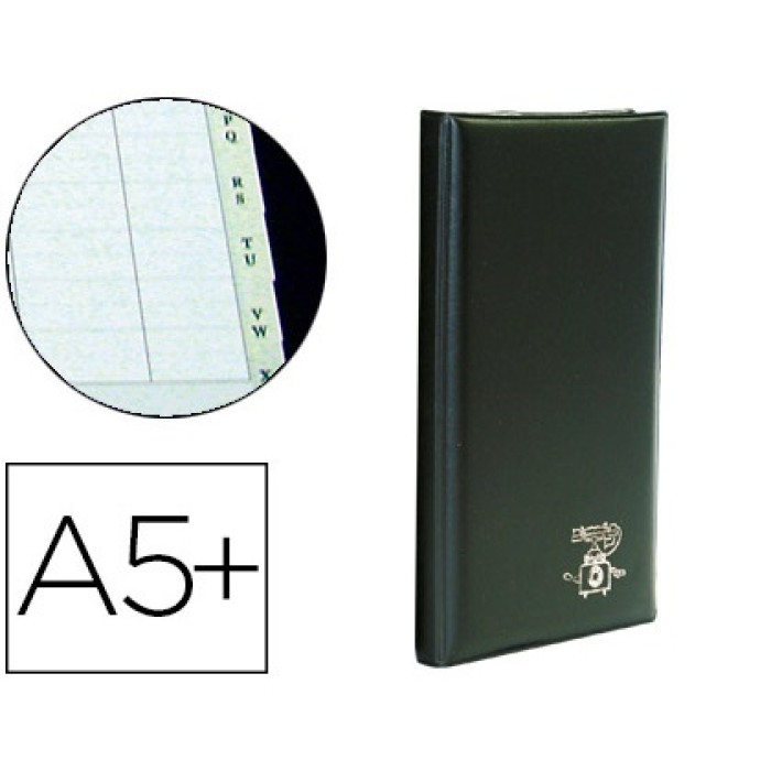 Listin telefonico sobremesa cuarto 17 23x18,5 cm 4 anillas. Práctica carpeta para la conservación ordenada de registros telefónicos. Fabricado en pvc. Mecanismo de cuatro anillas. Color negro. Medidas: 230 x 185 mm.