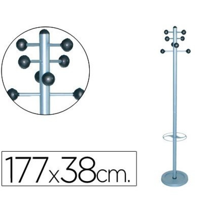 Perchero metalico 626 con paraguero -pie 8 colgadores 1,77x38 cm. Perchero metálico, pintado, con 8 colgadores y paragüero en la parte inferior. Color negro y plata. Medidas: ø 38 x 177 cm.