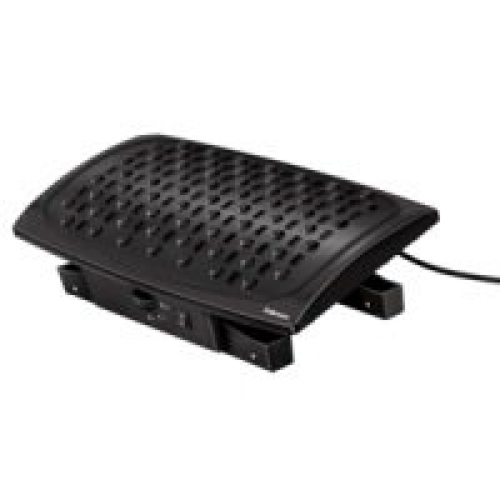 Reposapiés con sistema de calor/aire regulable que permite tener los pies a la temperatura deseada, ayudando a tener una situación más confortable en el puesto de trabajo Superficie de efecto masaje que favorece la circulación de las piernas Apagado automático después de 8 horas Potencia: 125 w (ajuste bajo) y 250 w (ajuste alto) 3 niveles de regulación de temperatura: aire, nivel calor bajo (125W), nivel calor alto (250W) Medidas de la superficie: 415 x 270 mm. Asjustable en altura: 105/120/135 mm e inclinable hasta 30º. Longitud del cable aproximadamente de 1.25 metros Certificado según norma ISO-9241 por FIRA Internacional
