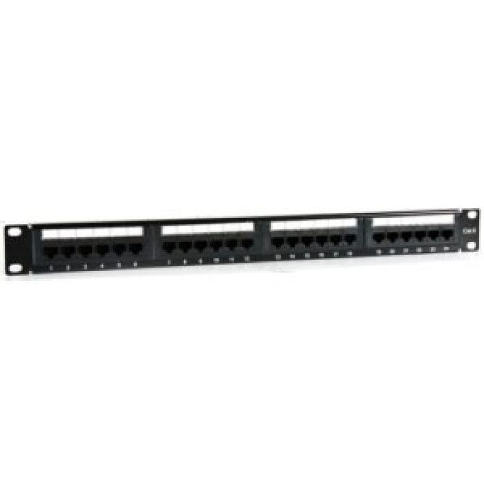 Patch panel 19" de 24 puertos cat.6 UTP Patch panel para ancho de perfil estándar de 19" con 24 conectores UTP, con bandeja trasera para enrutado de los cables, para redes de voz y datos.