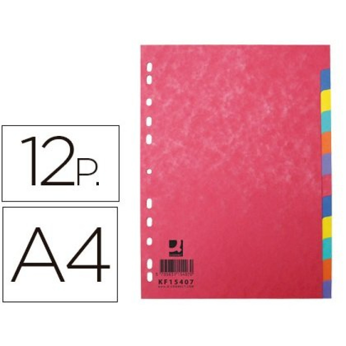 Separador q-connect cartulina brillo juego de 12 separadores din a4 multitaladro. Juego de separadores fabricado en cartulina brillo de color de 225 g/m². Disposición en escalera para agilizar la consulta e identificación de documentos. Multitaladro para archivar en diferentes mecanismos de anillas. Colores vivos opacos. En formatos din a4 y a4+.