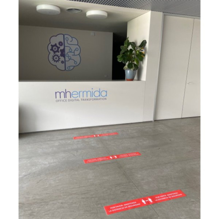 Vinilo adhesivo para suelo. Texto: "POR FAVOR, MANTENGA LA DISTANCIA DE SEGURIDAD" Para favorecer la distancia de seguridad en las zonas de afluencia, es recomendable colocar en el suelo este vinilo adhesivo. Fondo rojo. Texto color blanco. Dimensiones: 100 x 12cm Superficie antideslizante para evitar caidas. Tolera la limpieza con productos habituales, no abrasivos. Instalación: Colocar preferentemente sobre suelo liso de interior. Limpiar la zona previamente y dejar secar. Retirar la tira protectora posterior. Colocar con cuidado para mantener una línea recta Aplanar con un trapo desde el centro a los laterales. Colocar cada vinilo a una distancia de al menos 1 metro de distancia.