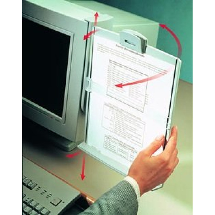 Diseñados según especificaciones ergonómicas, los 3M Document Holders son extremadamente estables. La facilidad de ajuste infinita de seis vías garantiza una visualización cómoda y ergonómicamente correcta. El diseño de bajo perfil y ahorro de espacio se conecta a ambos lados de la computadora y se pierde de vista cuando no esta en uso. Todos los modelos pueden contener hasta 150 hojas de documentos de tamaño carta legal y A4. El diseño de clip deslizante y la repisa acanalada mantienen los documentos verticales u horizontales en su lugar.