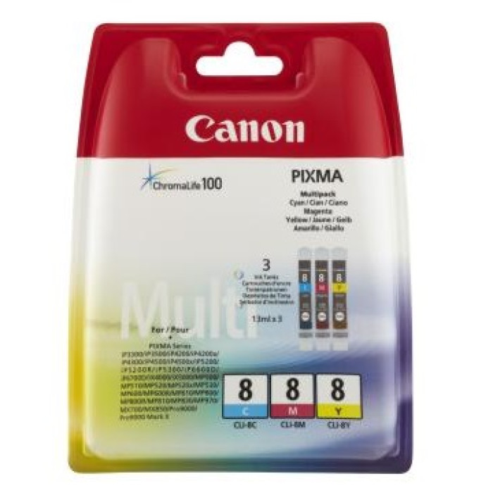 Canon cartucho multipack cian / magenta / amarillo (0621B029, CLI8), compatible para las siguientes impresoras: Canon Pixma IP 3300, IP 3500, IP 4200, IP 4200 Series, IP 4300, IP 4500, IP 4500 Series, IP 5200, IP 5300, IP 6600, IP 6700 D, IX 4000, IX 4000 Series, IX 5000, MP 500, MP 510, MP 520, MP 600, MP 610, Pro 9000, Pro 9000 Mark II