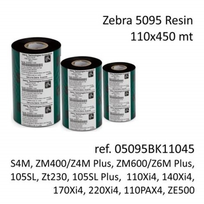 Zebra ZipShip Ribbons - cintas térmicas Para impresoras industriales de gama Mid-range / High-end ZM400, Z4M Plus, ZM600, Z6M Plus, ZT220, ZT230, ZT410, ZT420, ZT421, ZT510, ZT610, ZT620, 105SL Plus, 110Xi4, 140Xi4, 170Xi4, 220Xi4, 110PAX4, 170PAX4. 5095 High performance Resin (resina) Esta formulación especial de ZEBRA proporciona sobresaliente calidad de impresión para uso sobre papel o etiquetas sintéticas de ZEBRA, tanto mate como brillantes. Resistencia a productos químicos y a climatología. Resiste a borrones y rayaduras. Alta durabilidad. Etiquetas recomendadas: Z-Ultimate 3000T, Z-Extreme 4000T. Rollos con canuto interno de 25mm y longitud de rollo 450 metros. Ancho de ribbon: 110mm Cada caja contiene 6 unidades (ribbons) El precio indicado es de la caja de 6 unidades.